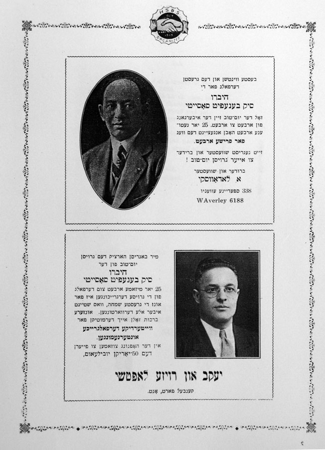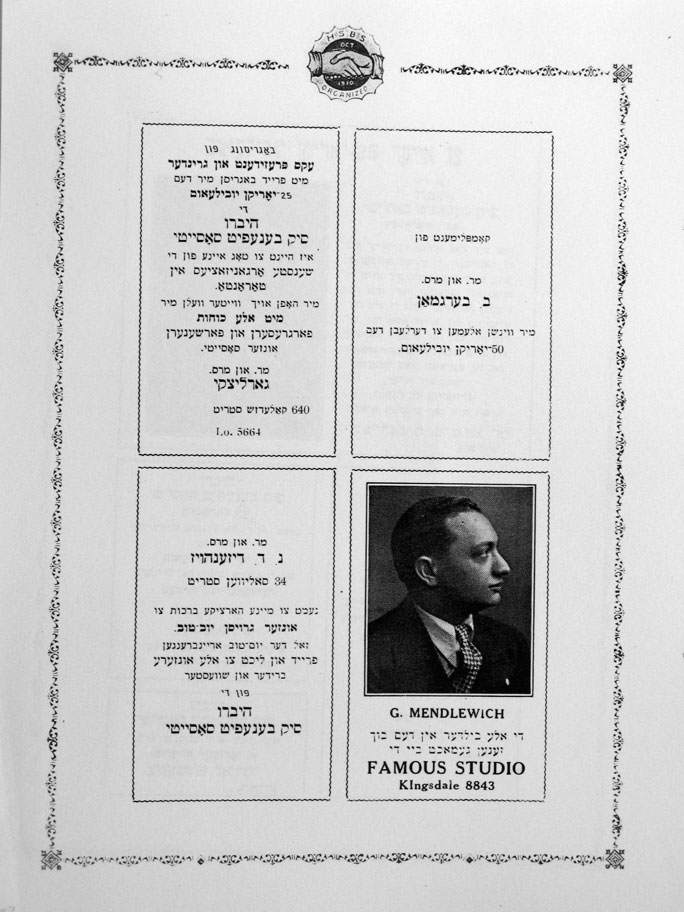 The following pages are from the souvenir booklet published by the Hebrew Sick Benefit Society of Toronto in 1935 upon the commemoration of its 35th anniversary. It contains many greetings, advertisements and other items from individual members, often listing family names and other details about family history. Most of the pages are in Yiddish. Each page is an expandable JPG; just click on it to enlarge it. Names on each page are listed in the file-name of each file; and also repeated as text below so as to come up in a search using this website’s search box. Note that not all pages of the booklet are here — only those with family photos or information have been included.