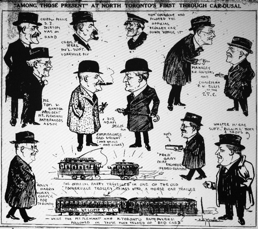 “This is a real Thanksgiving for North Toronto,” said P.W. Ellis, chairman of the TTC last night, while all the participants in the procession were waiting to board the cars. “I moved up here to Bedford Park with my wife and children 32 years ago and immediately began working for better transportation for North Toronto. . . .”