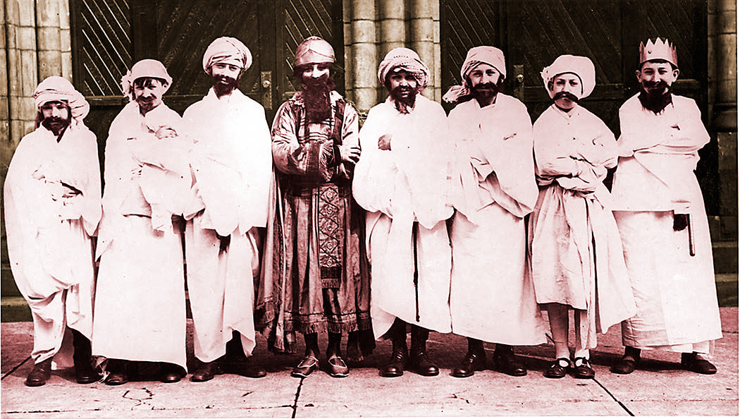 These costumed young actors appeared in a Purim play at the old Holy Blossom Temple on Bond Street around 1920. Perhaps the play was about the Purim drama itself. Pictured from left are: Arthur Cohen, Abe Cohen, Sam Nelson, Harry Hertzman, Louis Goodman, Norman Cowan (?), Sam Coffler and Lionel Cohen. Well-known Toronto photographer William James took the photo. Courtesy City of Toronto Archives (f1244_it2358).