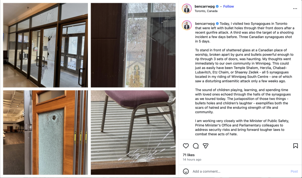 The language sounds strong. It is meant to reassure,” he wrote. “But if antisemitism truly had no place in Ontario, synagogues would not require concrete barriers. Jewish schools would not need armed security. Community institutions would not conduct threat assessments before hosting events.