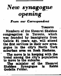 Shomrai Shabbos has long been active in Toronto’s Orthodox beit din for gittin (rabbinical court for Jewish divorces) and the Kashruth Council of Canada, which was strongly associated with the synagogue and Rabbi Gedalia Felder, the current rabbi’s father, who was spiritual leader from 1951 until his death in 1991.